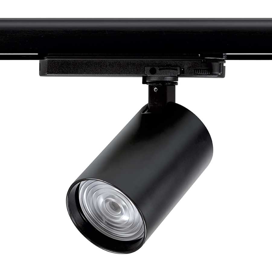 Proyector 615 de SIMON, cilíndrico con diámetro de 77,5 mm. Para instalación en carril trifásico regulable, con tecnología LED formada por múltiples LEDs de baja potencia con óptica Flood de ángulo 36°. Cuerpo fabricado en aluminio y pintado en Negro.