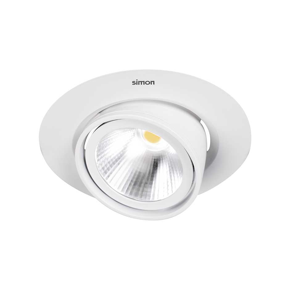 Proyector 640.10 Empotrado , de SIMON, con tecnología LED COB y reflector para una distribución fotométrica WIDE FLOOD de 40º . Cuerpo fabricado en inyección de aluminio y pintado en Blanco. Reflector de aluminio de alta pureza y disipador pasivo fabricado en aluminio de alta transmitancia totalmente integrado en el cuerpo de la luminaria. Frontal extraíble, que incluye vidrio de protección, que facilita la instalación de filtros dicroicos para modificar la temperatura de color y la tonalidad de la luz. Equipo electrónico incorporado, aislado del cuerpo óptico y de la temperatura que éste último genera. La luminaria es orientable 360º grados de rotacion horizontal y 30º en vertical. Lúmenes disponibles 2500 lm para WW, y consumo total de la luminaria de 30 W (eficiencia del sistema real de 84 lm/W ). Índice de reproducción cromática CRI>80 . Mantenimiento luminoso L70 >100.000h a 25ºC y L90>30.000H a 25ºc. Seguridad fotobiológica: Categoría Exento Dimensiones de la luminaria:120x170(diametro) mm. Peso: 0.9 kg IP 20. Tensión de alimentación de 120-240V, 50-60Hz. Marcado CE.