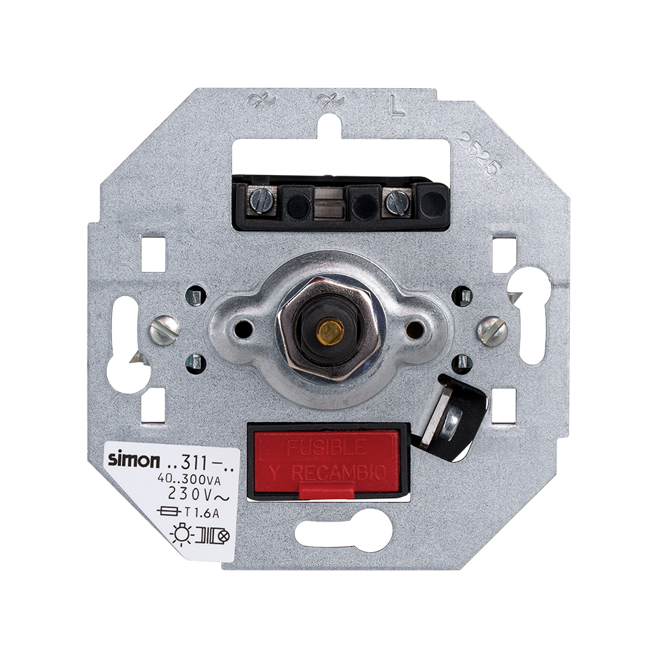 Regulador-interruptor de luz con funcionamiento giratorio de 40 a 300 W/VA de la serie Simon 75. Para su correcto funcionamiento requiere de una alimentación de 250 V~. Categorizado en el apartado de “regulador - interruptor” debido a su control giratorio para la intensidad de luz. El tipo de instalación se lleva a cabo mediante embornamiento por tornillo. Para su correcto funcionamiento no es posible conectar dos reguladores electrónicos de tensión diferentes a un mismo circuito. La serie Simon 75 se caracteriza por su fácil instalación y así lo demuestra con este elemento, apto para superficie y para empotrar con una facilidad pasmosa a la hora de realizar la instalación. Requiere además de una potencia mínima de 40 W y soporta una máxima de 300 W. Su fabricación se ha llevado a cabo con componentes metálicos con aislamiento termoplástico y libre de halógenos, de esta forma el elemento cumple con la normativa actual.