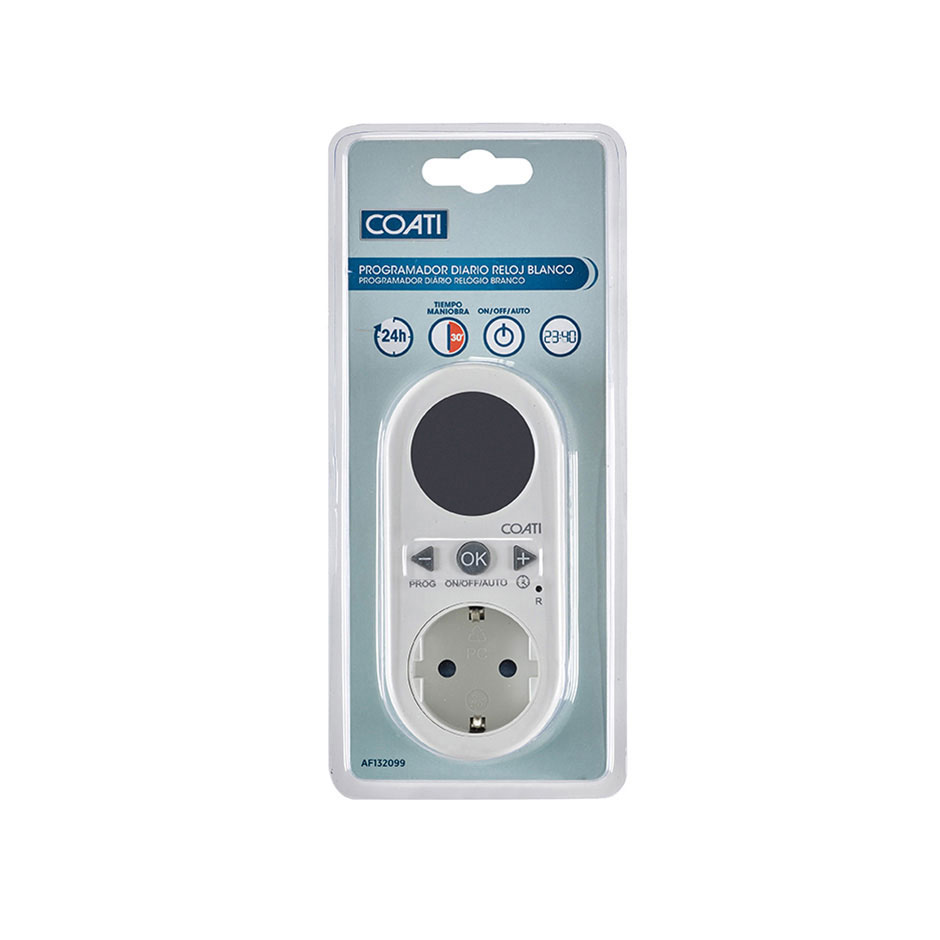 Este programador diario digital blanco de reducidas dimensiones de la marca COATI cuenta con una pantalla LCD que indica la hora actual, el modo de trabajo y su estado de funcionamiento. Es un temporizador de fácil configuración y uso intuitivo que cuenta con un interruptor con 3 posiciones, ON/Auto/OFF, y su modo automático permite fijar hasta 24 ciclos diarios con intervalos de conmutación de 30 minutos por ciclo. Dispone de una batería interna auto recargable, completamente cargada desde la fábrica, que permite mantener guardada la hora y la programación fijada durante 6 meses. El programador Coati se presenta en un blíster que se puede colgar en los lineales.