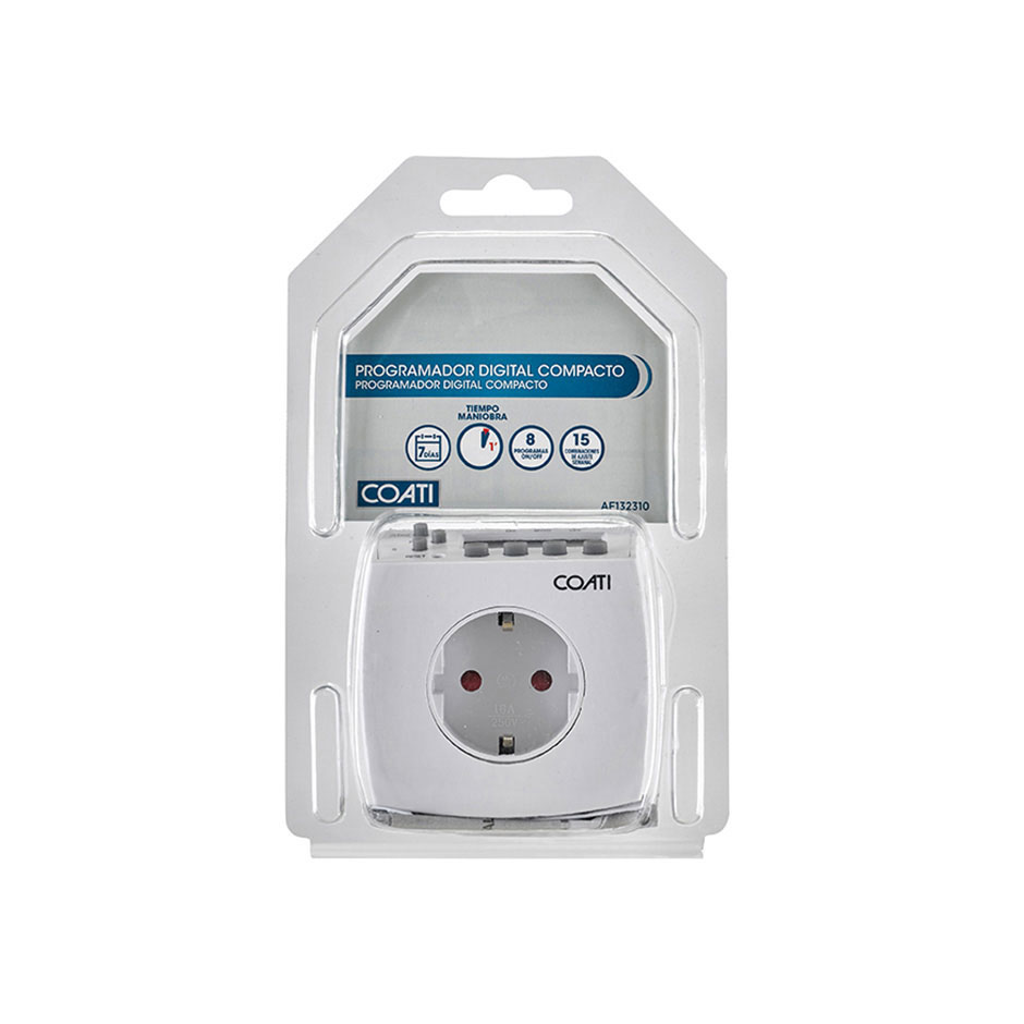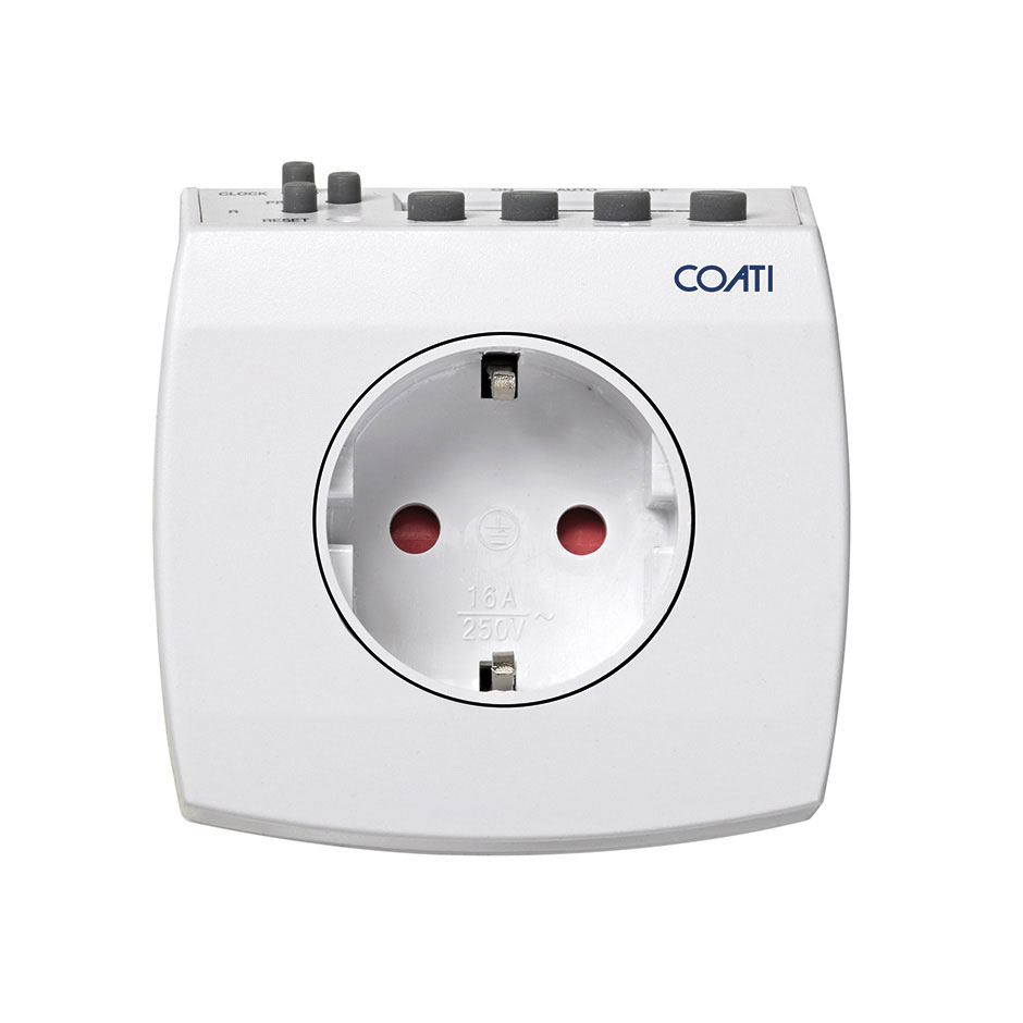 Temporizador semanal digital compacto blanco COATI que dispone de una batería interna auto recargable que permite mantener guardada la programación fijada durante 6 meses. Es un programador con funcionamiento ON/Auto/OFF con 7 programas ON/OFF con 15 combinaciones de ajuste semanal y un intervalo mínimo de conmutación de 1 minuto. Ofrece la función random especialmente útil para simular presencia en el hogar durante las vacaciones y la función reset.