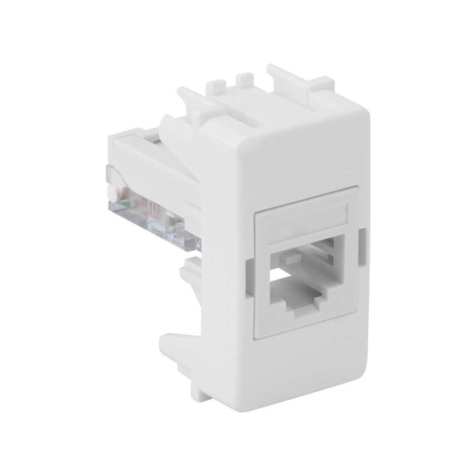 O módulo compacto da marca Simon 19 conta com uma tomada para conector RJ45 CAT6 com fixação fácil a pressão. O Cat6 trabalha com a taxa de 1gbps onde dois de seus pares trabalham como receptores (Rx) e outros dois pares trabalham com transmissores (Tx), cada par trançado do Cat6 tem capacidade de taxa de 500mbps, ou seja, 500mbps x 2 para recepção e 500mbps x 2 para transmissão. O componente de 22 x 41 x 35 mm de tamanho possui design moderno e em plástico de engenharia de cor branco. Este acabamento possui alta resistência contra radiações UV que danificam a cor do produto. Limpe com um pano macio e seco. Não use panos e / ou produtos de limpeza abrasivos que contenham cloro. O seu acionamento é de forma individual e foi projetado para embutir em superfícies planas e rígidas. Recomenda-se que a instalação seja feita por um profissional habilitado.