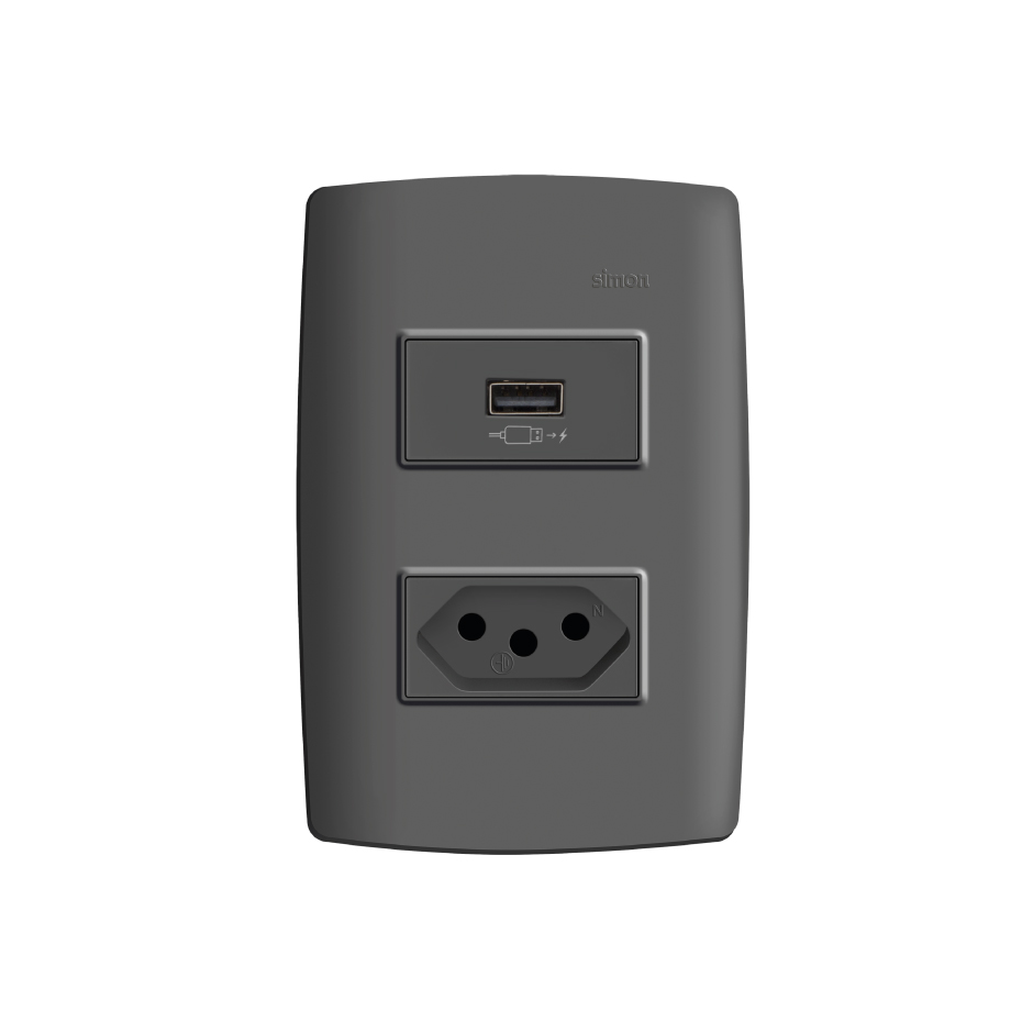Conjunto de 1 tomada USB 2.1 A 1 tomada 2P+T 10 A 250 V~ 1 placa de 2 postos 4x2 com suporte grafite Simon 30