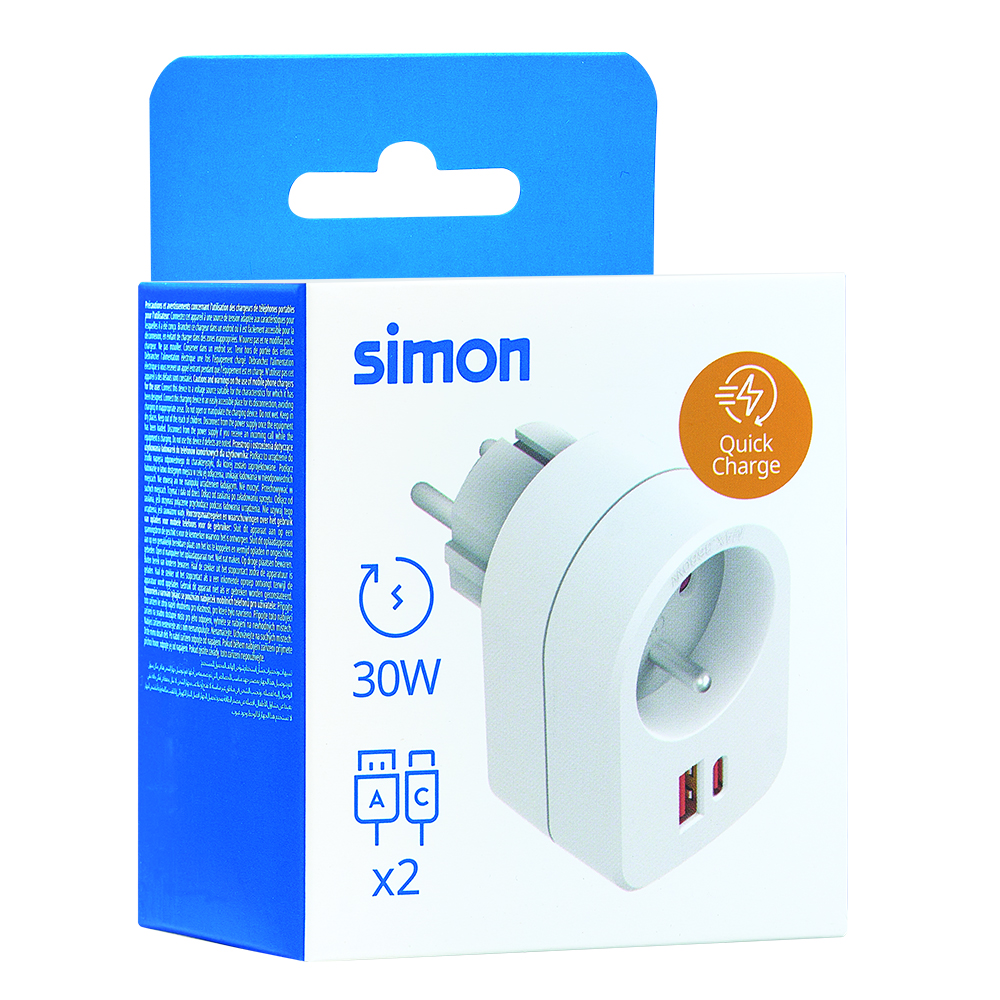 El adaptador Combi USB A + C con toma francesa de SIMON combina una toma de 16A con 2 puertos USB (A y C) con carga rápida 30W. Ideal para hogares y oficinas, permite cargar múltiples dispositivos sin perder el uso del enchufe gracias a su tecnología Quick Charge.