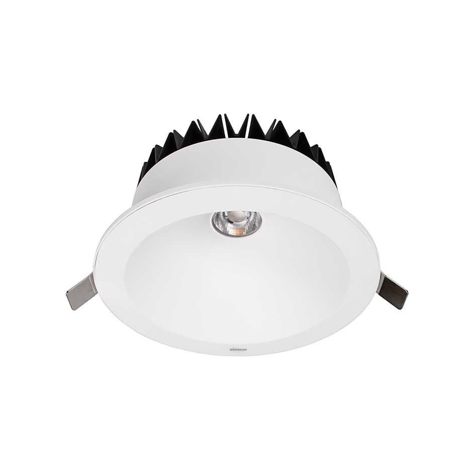 Downlight 735.30 de SIMON, rond, compact, encastrable, technologie LED avec lentille en PMMA pour une distribution lumineuse Extensive, IP20. Angle de défilement (cut-off) de 35º. Corps et Réflecteur en thermoplastique PC haute résistance, avec traitement anti-UV évitant le jaunissement dans le temps. Appareillage électronique intégré au luminaire, avec commande 1-10 V, réglette de raccordement à 5 pôles, fixées au dissipateur thermique et serre-câble. Dissipateur thermique en aluminium à haute conductivité, avec des ailettes à section constante pour un refroidissement optimal de la COB. Lumens disponibles 3500 lm pour Blanc neutre et consommation totale du luminaire 33 W (efficacité réelle du système 105 lm/W). IRC>80. Tension d’alimentation 220-240 V 50 Hz Maintenance lumineuse L70 >100 000 h à 25ºC et L90>50 000 h à 25ºC. Dimensions du luminaire : 230 mm de diamètre 110 mm de profondeur. IP20. Sécurité photobiologique : Bloc exempté. Hauteur d’encastrement : 160 mm. Dimension de coupe : 210 mm de diamètre Système de fixation par pinces haute résistance. Poids du luminaire complet 1,3 kg. Finition Blanc mat. Marquage CE.