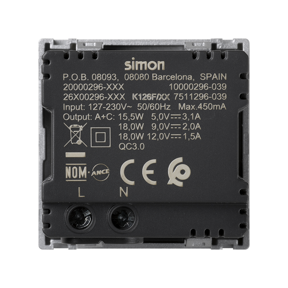 Con medidas de 45 x 45 mm, la base de carga K126G/14 tiene dos puertos USB tipo A+C acabado en aluminio. El módulo doble permite la carga simultánea de 2 dispositivos con una potencia de 18W con tecnología QuickCharge. Pero lo mejor, sin duda, es su fabricación con componentes metálicos recubiertos con aislamiento termoplástico autoextinguible y sin halógenos, asegurando que las llamas no se propaguen en caso de incendio, además de tener una baja toxicidad en caso de emisión de humos. La colección Simon K45 ofrece soluciones adecuadas incluso para los usuarios más exigentes, gracias a nuestro compromiso con la innovación y el uso de materiales de la más alta calidad.