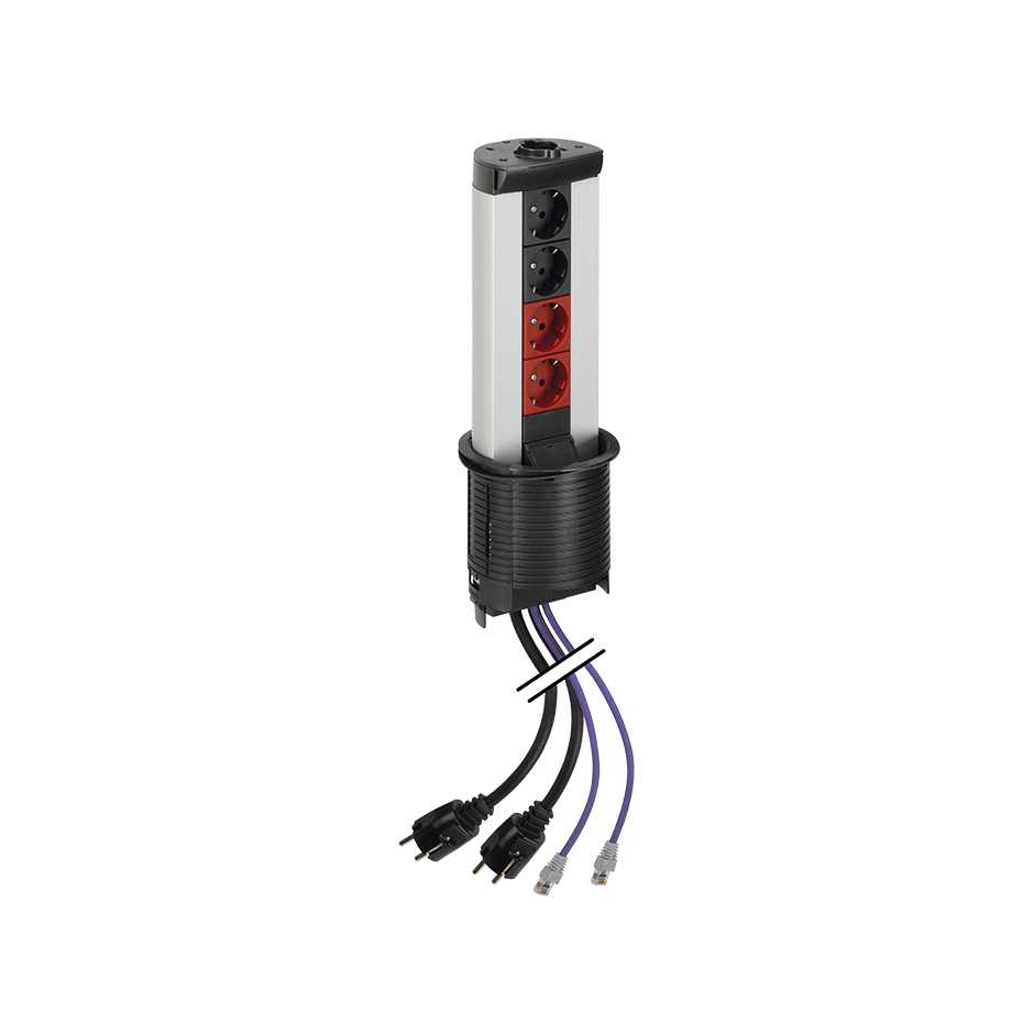 Perfil telescópico com elevação manual, 2 bases pretas, 2 bases vermelhas, 1 placa de voz e dados inclinada, 2 módulos adaptadores, 2 conetores RJ45 de categoria 6 UTP, 2 cabos elétricos de 2 metros de comprimento terminados em ficha Schuko, 2 cabos de voz e dados de 2 metros de comprimento terminados em conetor RJ45 macho, juntas antiderrapantes, divisória separadora metálica, 2 tomadas de terra, 3 placas cegas (1 larga e 2 estreitas), rosca de fixação e manual de instalação.