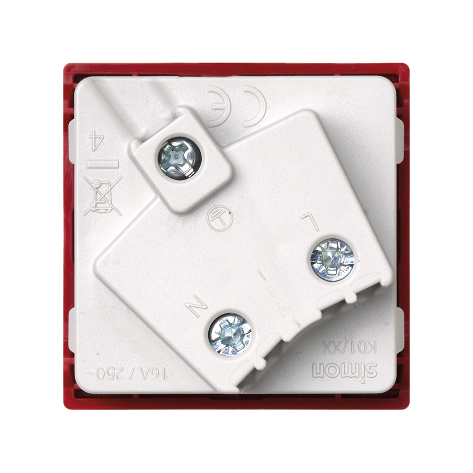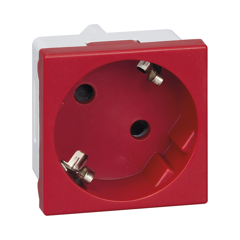 Base de tomada com formato schuko de versão individual com dois módulos da série Simon K45. Modelo de grande versatilidade e adequado para todo o tipo de superfícies facilitando a montagem incorporado, possui tipo de ligação de bornes por parafuso e acabamentos em tons de cor vermelho. Esta série de fichas schuko está desenhada para sistemas compatíveis de elementos de intensidade de 16 Amperes e 250 Volts de Tensão. A gama Simon K45 destaca por integrar componentes metálicos com isolamento termoplástico sem halogéneos que garante um grau de proteção e segurança profissional. A base de tomada K01/6 tem dimensões 45x45 mm e um descarnado de cabo de 12 mm conformando um componente ideal para qualquer tipo de instalação. É um modelo que proporciona uma montagem simples, rápido e seguro, adaptável para uma grande variedade de ambientes de trabalho, certificando uma qualidade de conexão profissional e estável.
